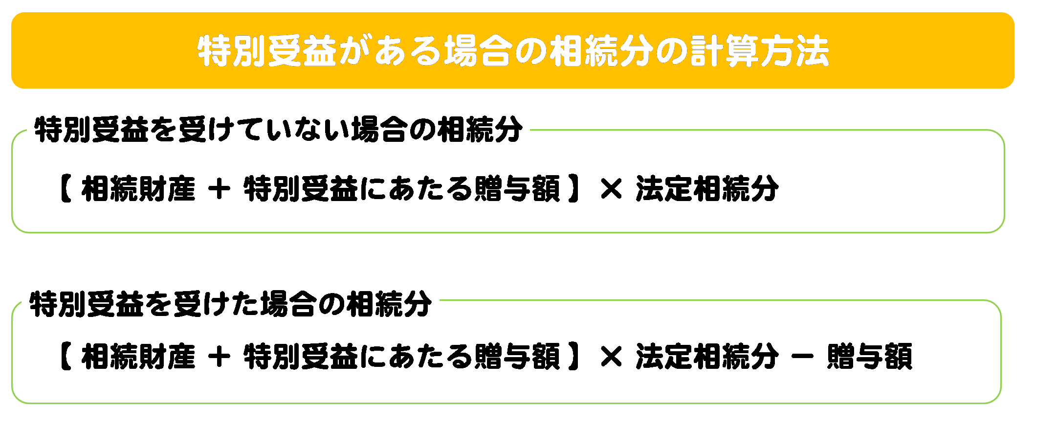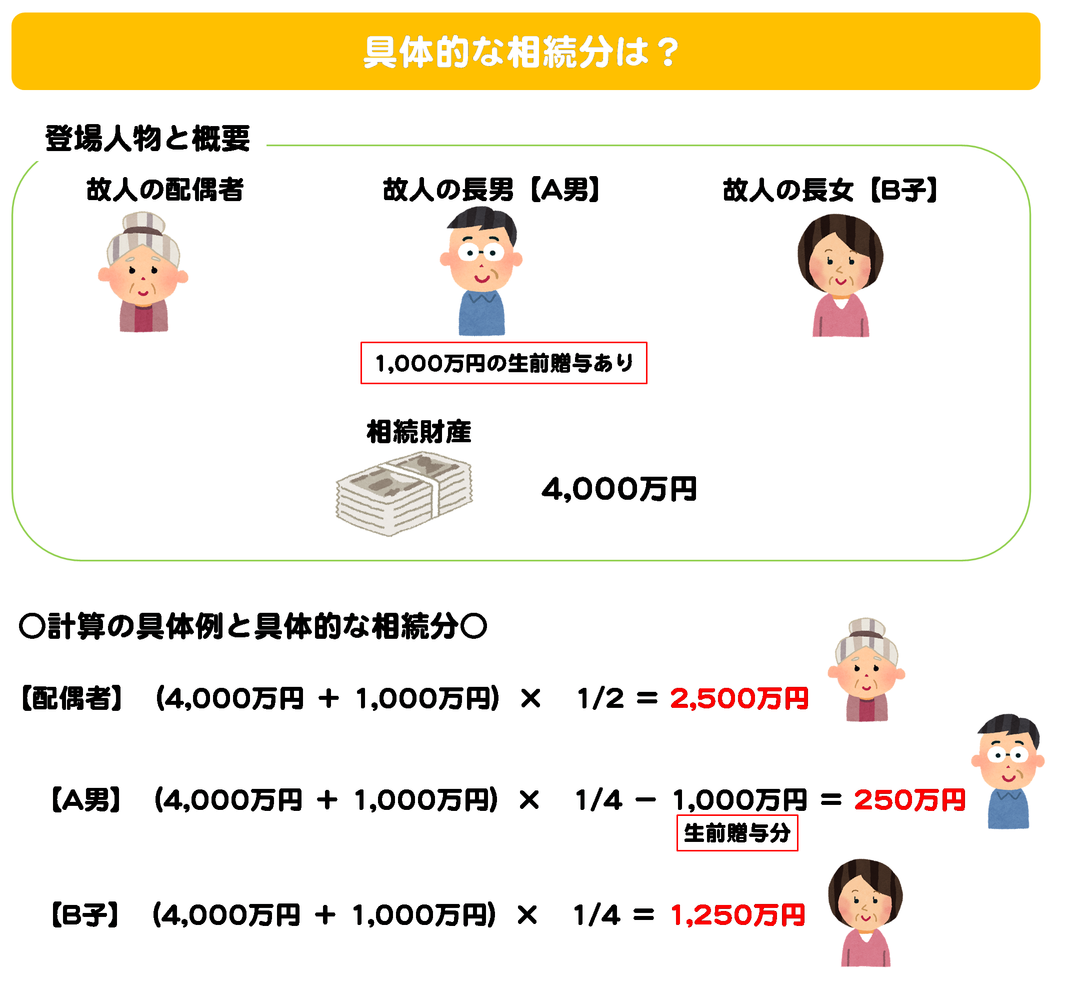 ※なお、この具体例は、特別受益が遺留分を侵害していない場合の計算方法です。遺留分による侵害があった場合は、もう少し計算が複雑になります。